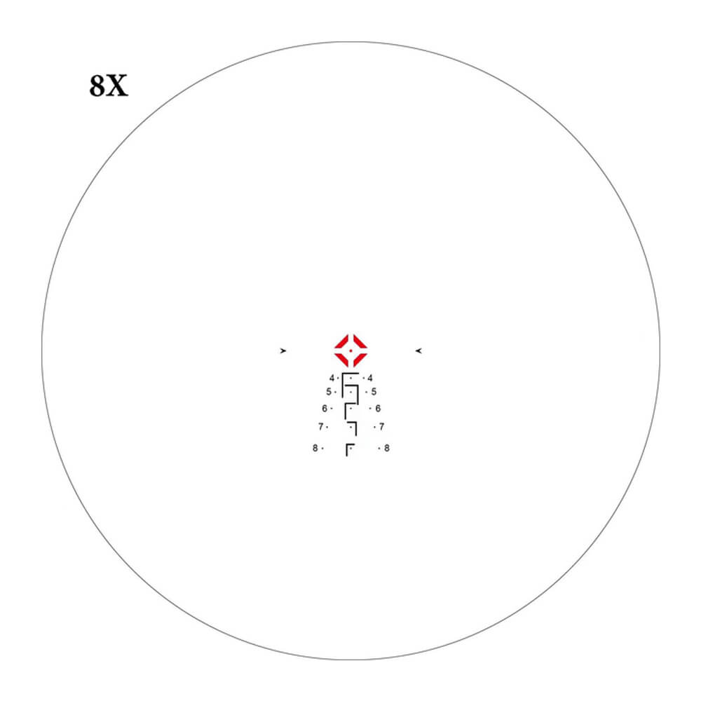 By framing a silhouette target in the appropriate KL box, the user is able to rapidly identify distance by simultaneously using shoulder width and torso height to calculate point of aim. With combat effectiveness in mind, this reticle allows for easy interpolation for any distance within the intended operational limits of a 1-8 allowing the user to acquire and process information faster and put effective rounds down range.