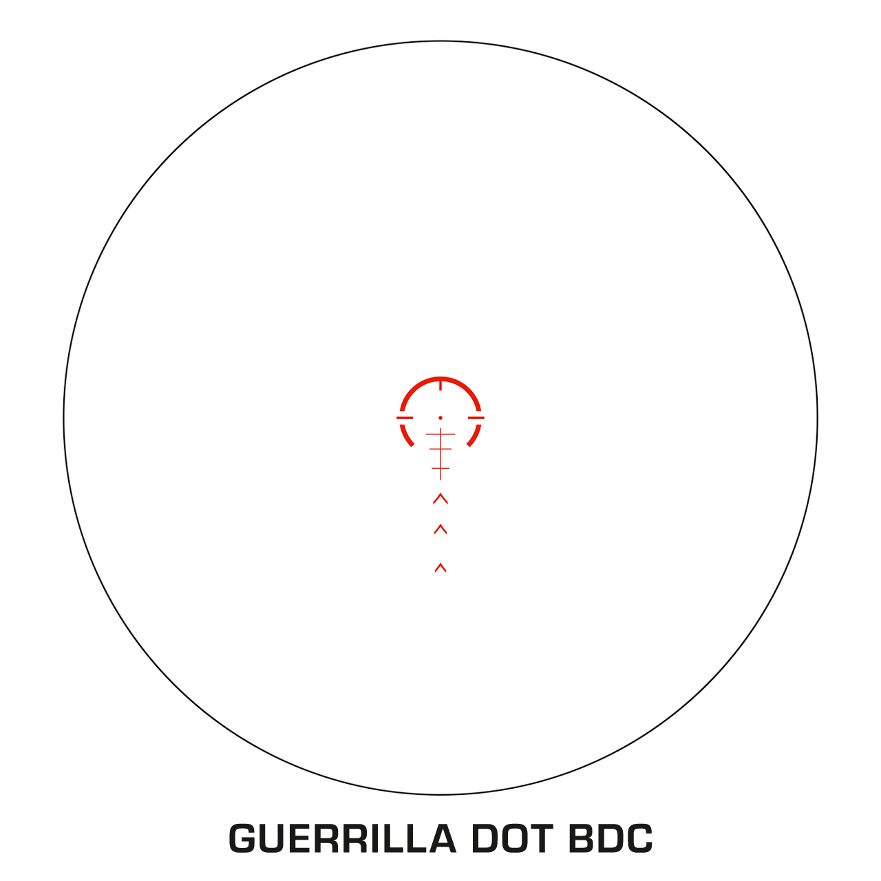 The Guerrilla Dot BDC Long reticle offers 5.56 NATO/.308 Win bullet drop compensation, with a 50/200 zero center dot for CQB (close quarters battle) and long-range capabilities. The reticle also includes holdover points for shots at 600, 700, and 800 yards. ​